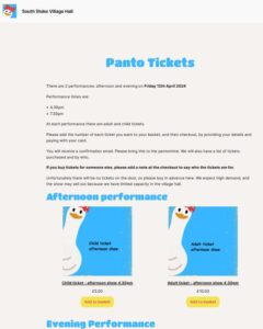 Village hall website – with availability calendar and shop taking payments for event tickets